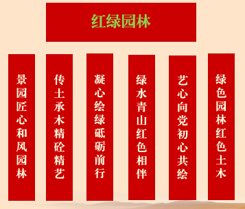 围绕暨阳“红种子”党建品牌,园林学院党总支秉承“求实精艺、树木树人”的院训,持续打造“红绿园林”党建品牌。党建红就是强化党建引领,充分发挥党组织的政治核心作用和师生党员先锋模范作用,让党建引领成为推进学院工作的“红色引擎”。园林绿就是围绕绿色发展理念,致力于生态文明、生态科技、生态产品领域的人才培养、科学研究和社会服务,突出学生实践和创业能力培养。同时各个党支部围绕学科专业特色,通过设立“景园匠心 和风园林”、“传土承木,精砼精艺”、“艺心向党,初心共绘”等支部特色品牌,努力为地方和社会培养知识、能力、素质协调发展的人居环境规划设计、建设和管理的应用型创业人才。