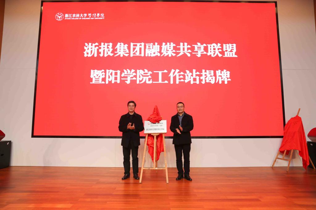 11月23日,浙报集团融媒共享联盟太阳成集团tyc33455ccwww工作站揭牌仪式在太阳官网举行。学院党委书记潘国忠、党委副书记高国俊,浙报集团绍兴分社总监周智敏、采编中心主任苗丽娜出席仪式。仪式由学院办公室负责人主持。
