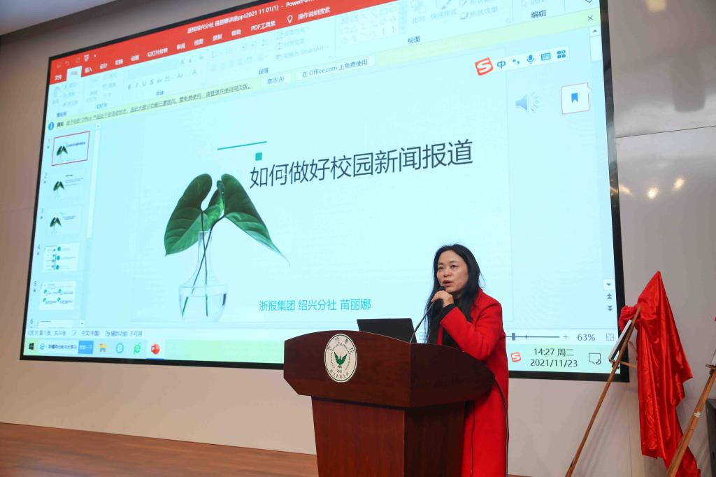 会上,还举行了新时代“枫桥经验”社会实践(课程)网上实践基地揭牌仪式和校外指导老师以及学生记者聘任仪式。浙报集团绍兴分社采编中心主任苗丽娜作了《如何做好校园新闻报道》的讲座。