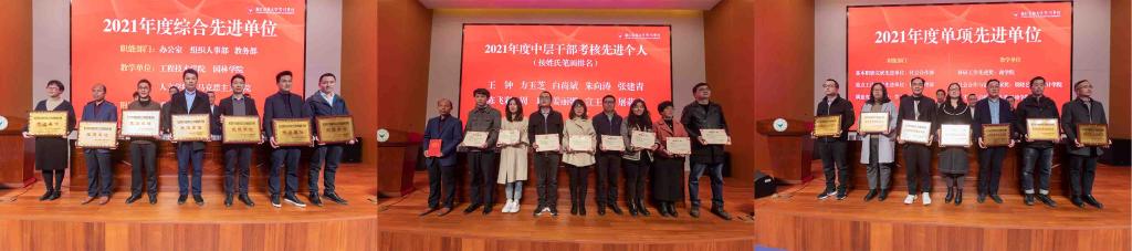 会上,还对获得2021年度考核优秀单位、单项先进单位、优秀党总支和优秀中层干部进行了表彰,李文莉副院长宣读了发表彰文件,学院领导为先进单位和个人颁奖。