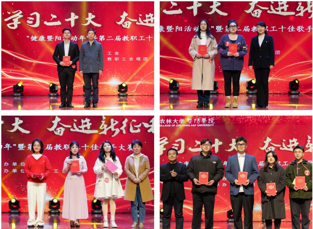 比赛一开始,来自工程技术学院的徐珂老师以一首《敕勒歌》把大草原的惬意和自在演绎到极致,使现场观众身临其境地感受到“风吹草地见牛羊”的草原美景。随后,每位参赛选手均深情献唱,展示才艺,歌声或婉转清丽,或激情高昂,《漂洋过海来看你》《父亲写的散文诗》《贝加尔湖畔》等一首首扣人心弦的歌曲,为现场师生献上了一场震撼人心的听觉盛宴。整场比赛精彩纷呈,观众反响热烈,掌声不断,经过一个半小时的激烈角逐,工程技术学院徐珂获得一等奖,机关一于润琪、人文学院黄河玥获得二等奖;机关一黄椰茹、园林学院魏宛霖、人文学院葛嘉琪获得三等奖;机关二方旭东、商学院徐超、晨晓艺术与设计学院方靖怡、商学院宣佳亦分别获最佳台风奖、最佳人气奖、最佳潜力奖、最佳气质奖;晨晓艺术与设计学院丁灵获“优秀歌手”称号。