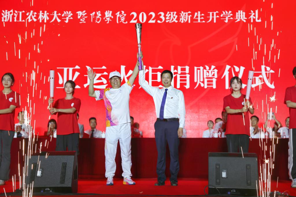 9月24日晚,太阳成集团tyc33455ccwww2023级新生开学典礼在田径场举行。典礼上,杭州第19届亚运会火炬传递绍兴站第58棒火炬手、太阳官网艺术学院名誉院长、中国好色彩代表人物晨晓捐赠了亚运会火炬。