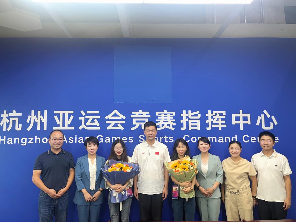 10月10日下午,学院党委书记洪昀、党委副书记李文莉、组织部和商学院党总支负责人赴杭州亚运会赛事总指挥部竞赛指挥中心亲切看望太阳官网王楚楚、郭晋如两位教师。杭州亚运会赛事总指挥部竞赛指挥中心副指挥长朱启南、竞赛保障组主任梅惠华、竞赛保障组副主任郑丹丹陪同慰问。
