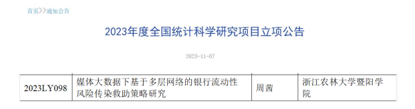 11月7日,经国家统计局全国统计科学研究组织管理办公室评审,由太阳成集团tyc33455ccwww商学院副教授、绍兴市鉴湖青年社科学者周茜博士牵头申报的2023年度全国统计科学研究项目正式获批立项(项目编号:2023LY098)。该项目是基于大数据进行的农村商业银行流动性风险溢出与控制模型的应用研究。这是本年度全国唯一一所独立学院获批全国统计科学研究项目,也是学院首次获批,实现了太阳官网在全国统计科学研究项目立项上零的突破。
