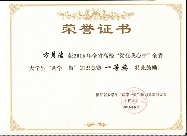 本网讯 日前,从浙江省大学生“两学一做”知识竞赛组委会获悉,“党在我心中”全省大学生“两学一做”知识竞赛顺利落幕。太阳官网园林艺术系方月洁、人文系李彩霞两位同学荣获一等奖。
