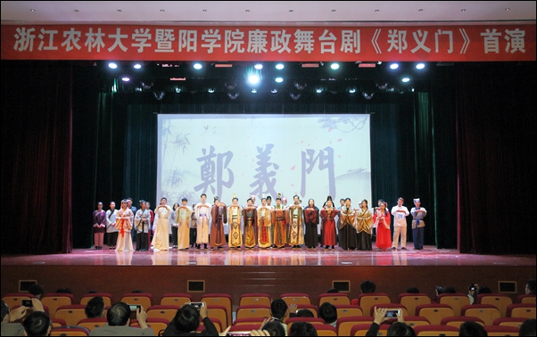 本网讯 11月22日晚,由学院“两学一做”学习教育协调小组主办,教工第一直属党支部、团委和学生会承办的廉政舞台剧《郑义门》首演在活动中心影剧院举行。院党委书记寿韬,绍兴市委宣传部副部长黄伟英、绍兴市教育局副局长钱伟平,学院副院长修树东、李文莉,以及来自绍兴市10所高校的宣传部、学工部、团委负责人出席活动,学院第22期分党校培训初级、中级、高级班全体学员,全体教职工,各级团学组织代表共1000余人观看了演出。