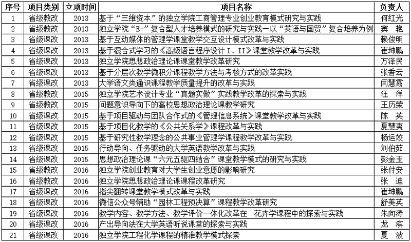 2013年以来,获市级以上教育教学改革项目立项70项,其中省级立项21项。对慕课、翻转课堂的建设积累了一些经验,《微积分》《大学英语》《经济法》《思修道德修养与法律基础》等33门课程进行课堂教学改革取得明显效果,学生的学习积极性、实践能力、创新思维得到了很大提高,课堂教学改革取得明显实效。