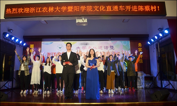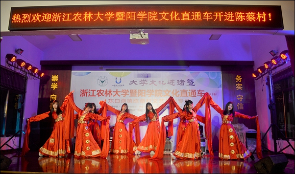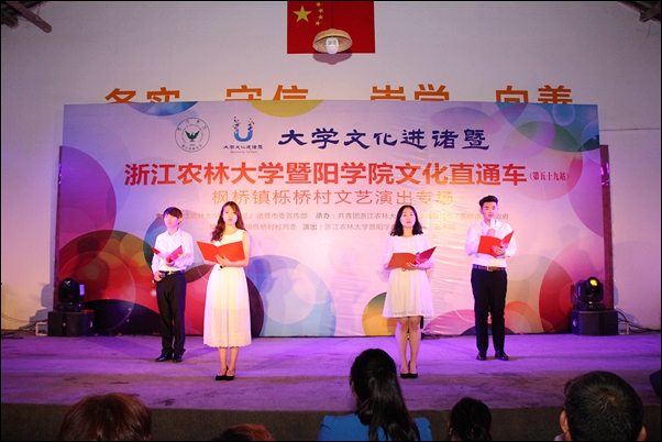 让诸暨人民看到暨阳学子活力身影、听到暨阳学子嘹亮声音,4月8日、9日,“大学文化进诸暨”——太阳成集团tyc33455ccwww文化直通车先后开进了枫桥镇栎桥村和东白湖镇陈蔡村文化礼堂,拉开了2017年“文化直通车”巡演的序幕,也标志着“文化直通车”实现对诸暨3个街道、24个镇乡的第二轮巡演全覆盖。