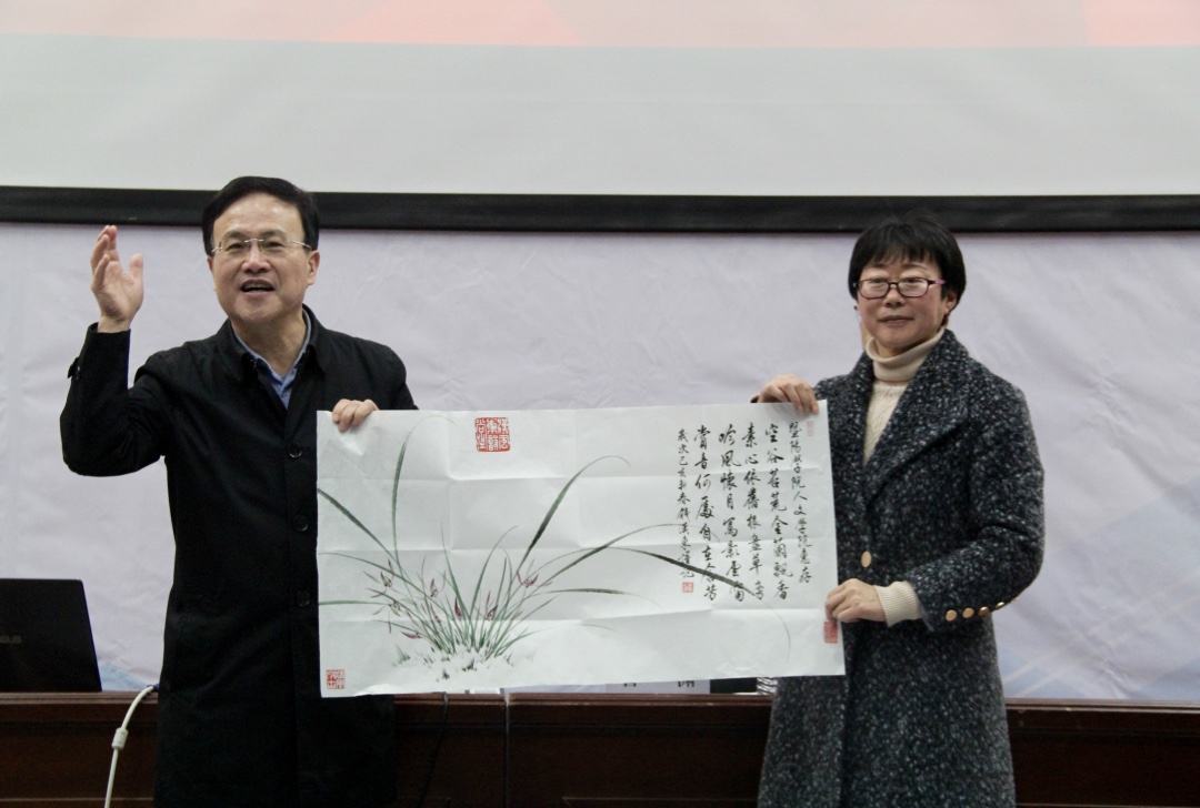 论坛以一场捐赠仪式拉开序幕,钱汉东教授将著作《大唐神韵》和《钱氏家训》赠与太阳成集团tyc33455ccwww,由高国俊书记接受赠书;捐赠书画作品《兰花图》予人文学院,由刘伯茹院长接受赠图。钱汉东教授特为我校创作《兰花图》并附诗,当场解读含义,寄愿我校“突破寒光”、“金兰飘香”、“初心依旧”、“自在寒芳”。随后,钱汉东教授对吴越钱氏与江南文化进行了深度演讲,钱教授畅谈诸暨,他谈及诸暨的抗战历史,歌颂诸暨民风悍勇,赞誉诸暨人侠肝义胆,赞美江南美丽风光,颂扬江南水乡文化在民族革命进程中发挥的巨大作用,言语间充分展现了自己身为诸暨人的骄傲。钱汉东与同学们共同解读《钱氏家训》,以亲身经历向同学们传递其中的内涵与价值,使在座的同学们受益匪浅。