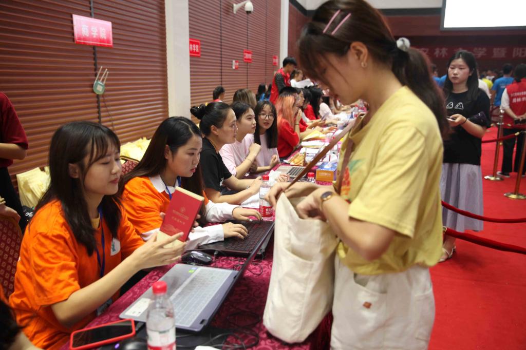 拉着手提箱,脸上挂着笑容,在父母亲的陪伴下,2019级新生前来报道。在迎新老师和学生志愿者的引导下,办学入学手续有条不紊。人文学院志愿者一身橙色,精神饱满,满怀热情,在新生人群中奔波忙碌着。在志愿者的带领下,新生和家长领取报到须知、打印报到单、领取校园卡、填写个人信息、办理宿舍入住手续等。迎新现场还设立了现场咨询点、综合服务点、医疗服务点等,为新生和家长提供全方位的服务。