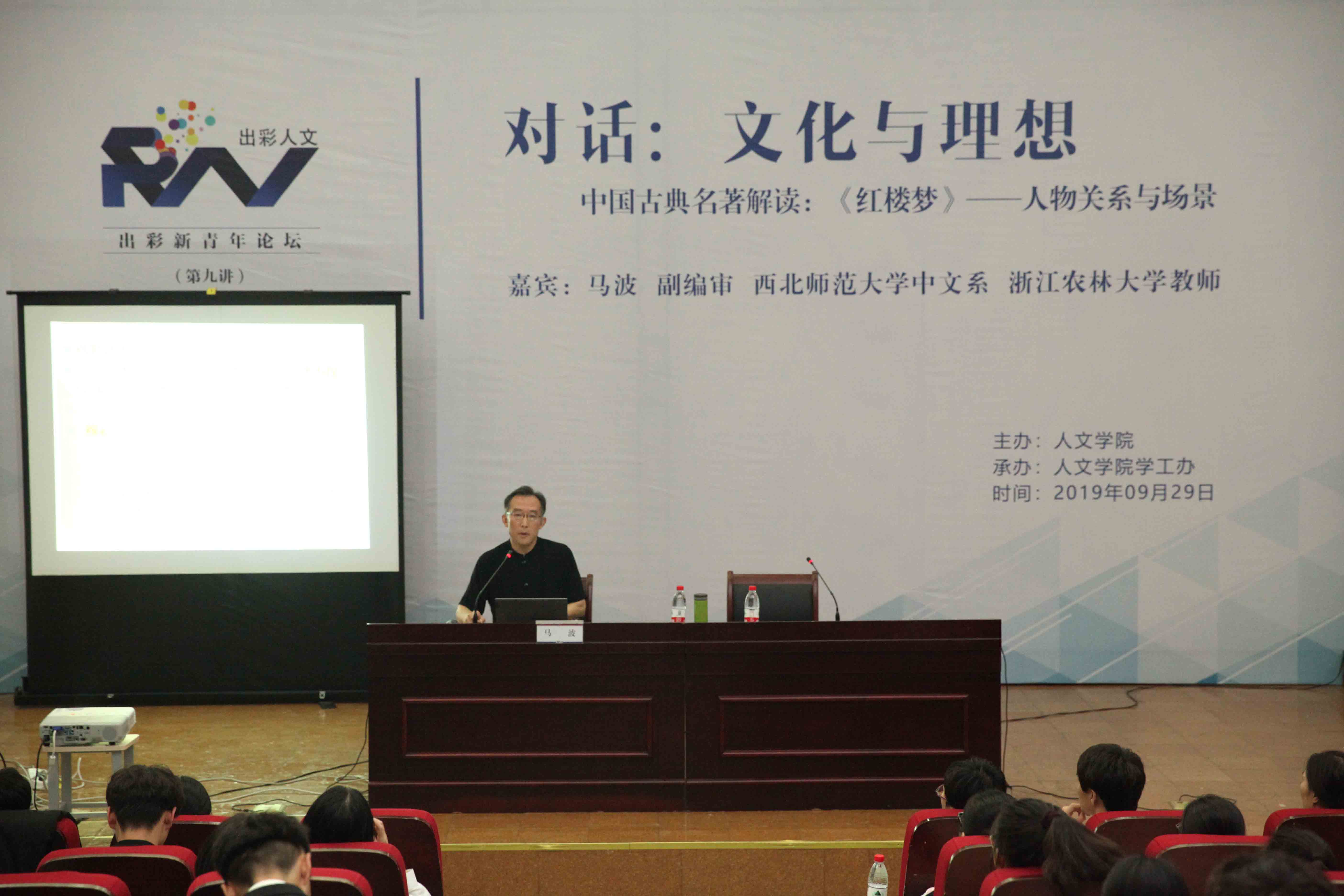 放飞青春梦想,成就出彩人生。9月29日晚,人文学院在人文楼4110举行了出彩新青年论坛第九讲。副编审、西北师范大学中文系、浙江农林大学教师马波老师作客论坛,与我们分享了他对中国四大名著之一《红楼梦》的人物关系场景的解读。人文学院院长刘伯茹、党总支书记宣王威、学生办全体辅导员、人文学院团学学生干部、2019级新生等250余人出席本次论坛。