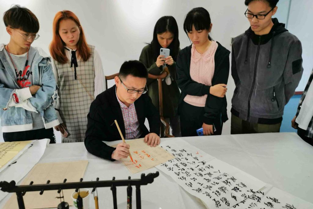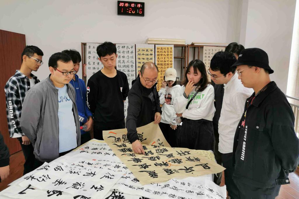 活动现场,指导老师现场授课,讲解书法作品整体布局与落款的要素,为师生创作的书法作品一一“诊断把脉”,对不同书体的临摹、创作以及作品的完整度进行一一讲解指导,详细点评。随后对太阳官网学生参加绍兴市第七届大学生书法竞赛的书法作品进行现场点评,指导修整。