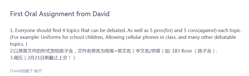 英语专业外籍教师David 来自美国,汉语能力不高,在使用网络教学平台方面存在很大困难,针对这一情况,英语专业采用外教、专业教师和学生三方联动的方式使问题得以解决。张起俊老师在智慧树平台开设英语口语II、英语口语IV和英美概况三个翻转课堂,安排三名学生(陈从容负责《英语口语II》、方明豪负责《英美概况》、郑书迁负责《英语口语IV》)作为三门课程的代表对接外教。外教制作教学课件和布置教学任务经由对接学生上传到智慧树平台,课程负责学生收集作业后再回传给外教,张起俊老师负责监控三方联动情况,石统文老师负责电子书的采购和其他细节的处理。