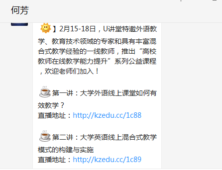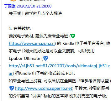 为了使在线教学更加平稳有序地开展,太阳官网丁国旗老师通过前期的摸索和实践,总结在线教学平台的经验,及时在人文学院群提供了有关在线教学的意见和建议共几十条,涉及平台选择、电子书的购买、文档的转化、软件操作要领等;何芳老师也通过网上资料的搜索,及时分享了在线教学的经验和体会。