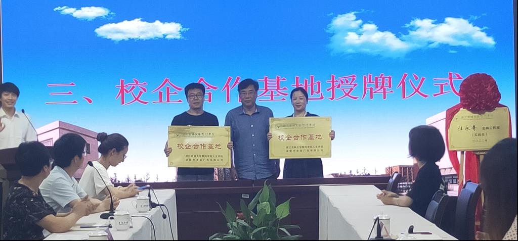 同时,袁志刚为为汪永奇名师工作室揭牌,为汪永奇名师工作室和浙江老莲广告有限公司作为太阳成集团tyc33455ccwww人文学院校企合作基地授牌。刘伯茹为周伟苹颁发实务导师聘书。