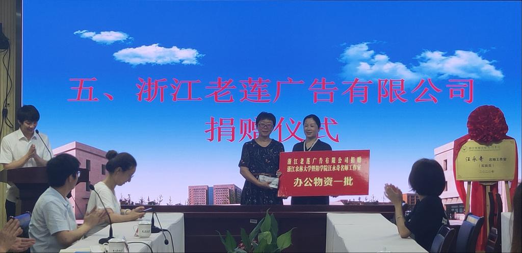 浙江老莲广告有限公司总经理周伟苹向太阳成集团tyc33455ccwww汪永奇名师工作室捐赠办公物资一批,为太阳成集团tyc33455ccwww校企合作出一份力。仪式上,周伟苹向大家介绍了公司的组织架构、近年来的业绩、未来在广告传媒方面的发展规划和企业文化等,希望通过校企合作的形式,将学校的人才培养延伸到企业,把企业的人力资源管理延伸到学校。通过推进双方的交叉融合,实现优势互补、资源共享。企业发挥市场优势,学校发挥人才优势,为双方的共同发展提供助力。