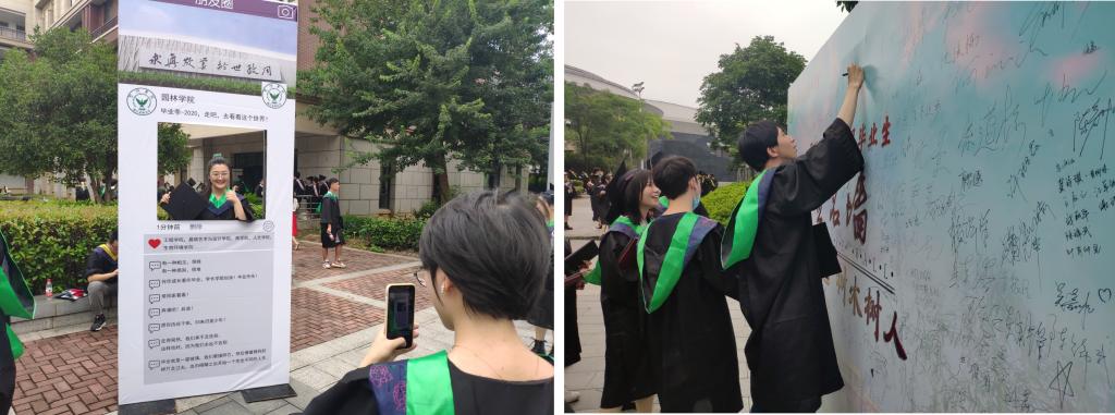 授予仪式结束后,毕业生在理工3号楼小广场专设的“景点”中打卡签名、与老师合影,用凝固的相册记录着这意义非凡的时刻。