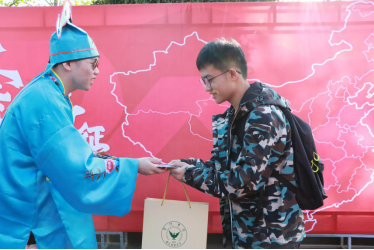 迎新现场设置“人生新征程”展板,在地图上用彩绳牵起新生来源地和诸暨所在地,寓意着来自五湖四海的新生共同汇聚在太阳成集团tyc33455ccwww。四大“彩”子为每位新生送上成长大礼包。新生在展板前拍照留念,他们微笑着、紧张着、羞涩着,但也期待着。在他们的背后是四面八方的家乡,而眼前则是他们未来所奔赴的星辰和大海。