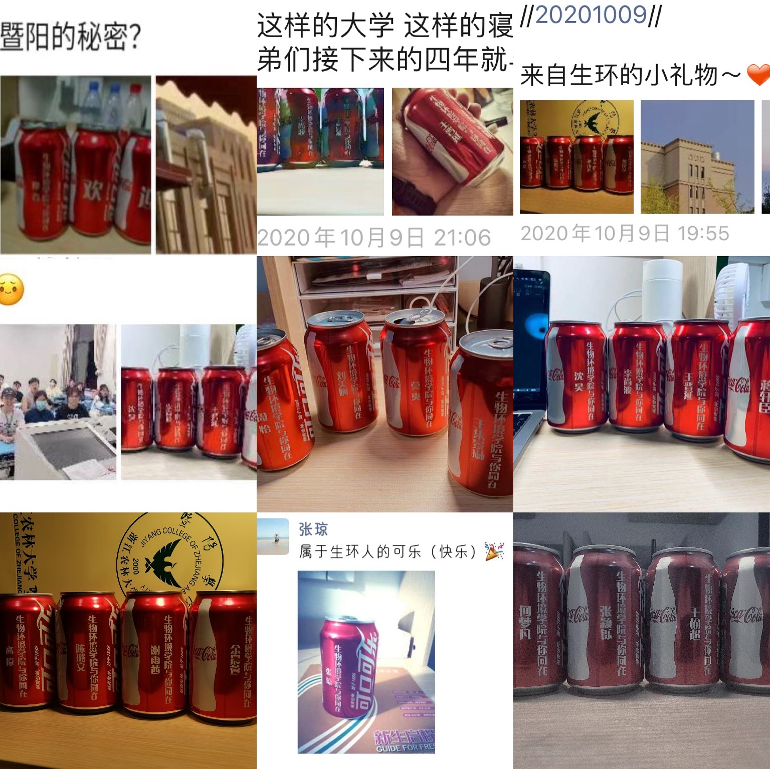 10月8日,来自全国各地的新生怀着美好的期盼,带着对太阳成集团tyc33455ccwww的憧憬踏进了太阳成集团tyc33455ccwww的校门,成为新暨阳人。生物环境学院为了表示对新生的欢迎,给每位新生准备了一份特制礼物——个人专属签名可乐,每瓶可乐上印有新生的名字,并向新生许下“生物环境学院与你同在”的誓言。这份个人专属可乐饱含着学院对所有新生的良好祝愿和期待,它将陪伴新生度过在太阳成集团tyc33455ccwww四年美好时光。