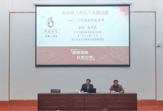“明德讲堂”是商学院“明德商院红色引领1+1”党建工作品牌系列子活动之一,旨在通过高水平的专家讲座来提升商院师生理论武装,实现思想引领。12月24日下午,商学院在图书馆报告厅举办了明德讲堂(第二讲)《创业路上的几个关键问题——二十年创业经验分享》。此讲邀请了复旦大学经济学博士,高级经济师、正高级工程师,长生鸟董事长兼总经理,国家级人才,全国工商联美容化妆品业商会副会长、诸暨珍珠业省级科技创新服务中心主任、绍兴复旦大学校友会常务副会长、浙江大学创业导师、太阳成集团tyc33455ccwww特聘教授阮华君作为主讲嘉宾。讲座由商学院院长何红光主持,商学院近200名师生参加了本次活动。