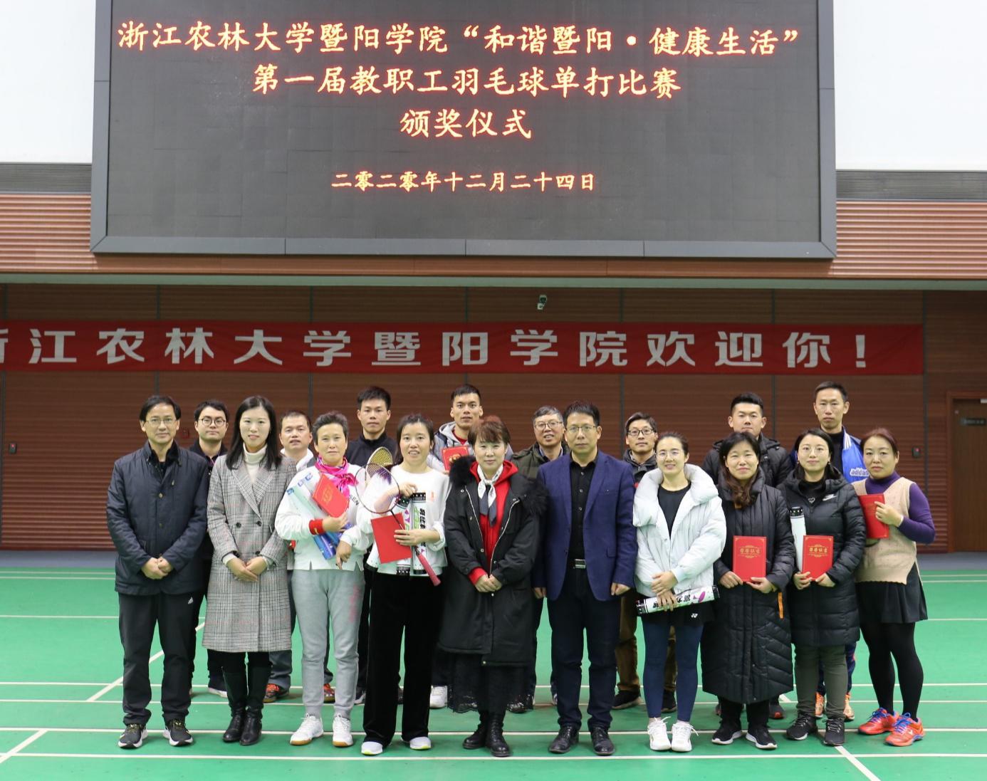 12月24日晚,由学院工会主办、教工网羽俱乐部承办的第一届教职工“和谐暨阳·健康生活”羽毛球单打比赛决赛在网球馆举行。