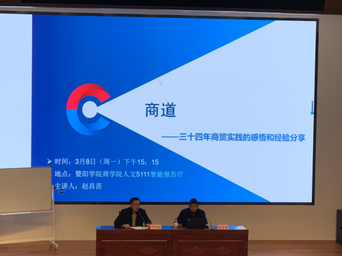“明德讲堂”是商学院“明德商院红色引领1+1”党建工作品牌系列子活动之一,旨在通过高水平的专家讲座来提升商院师生理论武装,实现思想引领。3月8日下午,商学院在人文5111智能报告厅举办了明德讲堂(第三讲)《商道——三十四年商贸实践的感悟和经验分享》。此讲邀请浙江大学对外经济技术贸易有限公司高级工程师,诸暨意创磁性技术有限公司董事长总经理,太阳成集团tyc33455ccwww兼职教授赵昌苗作为主讲嘉宾,讲座由商学院院长何红光主持,商学院近200名师生参加了本次活动。