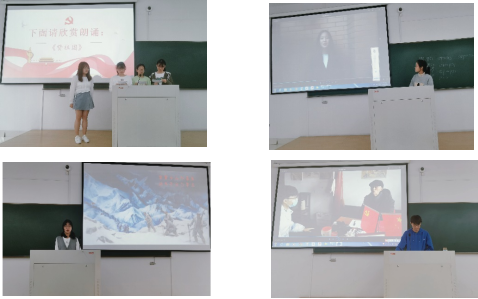 在主持人激情的主持下,共19个小组进行了课堂汇报。第一个上台的是第3小组,虽然略显紧张,但不仅用精心制作的PPT向大家讲述了红岩精神的内涵以及作为新时代的大学生如何用自已的实际行动传承红岩精神,还向大家展示了课后录制的小组朗诵视频;后面上台的小组以多种方式进行了精彩的演讲汇报展示;而最后上台的第6小组令人眼前一亮,他们在在集体朗诵“赞祖国”的基础上,还展示了在课后自已录制的情景剧——“红船儿女”的短视频,这个小组的演讲为本次活动画下了圆满的句号。