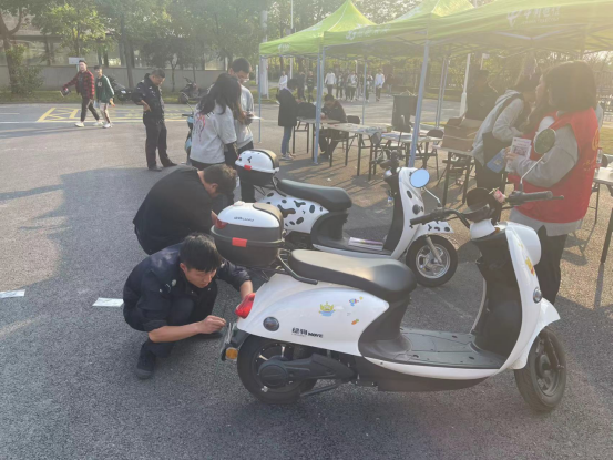 为做好此项工作,公共保障部提前发布通告,主动对接交警在第二食堂门口设立电动车备案登记点。经过两天的努力,完成了387辆电动车备案登记、数据录入、上牌等一系列工作。活动现场,公共保障部工作人员、学生志愿者、交警通过向师生发放宣传资料、讲述事故案例等形式,面对面向师生讲解不按规定佩戴头盔案例、超速超载等交通违法行为的危害,取得了良好的宣传效果。
