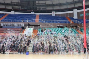 典礼开始前,人文学院特别举行“多彩青春”纪念仪式,全体毕业生在工作人员的引导下,拿着代表希望与未来的彩带,依次通过“青春纪念跑道”,在口罩墙签下自己的名字,最终到达篮球馆。