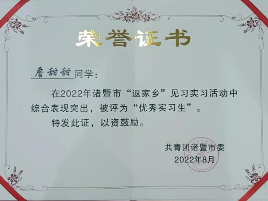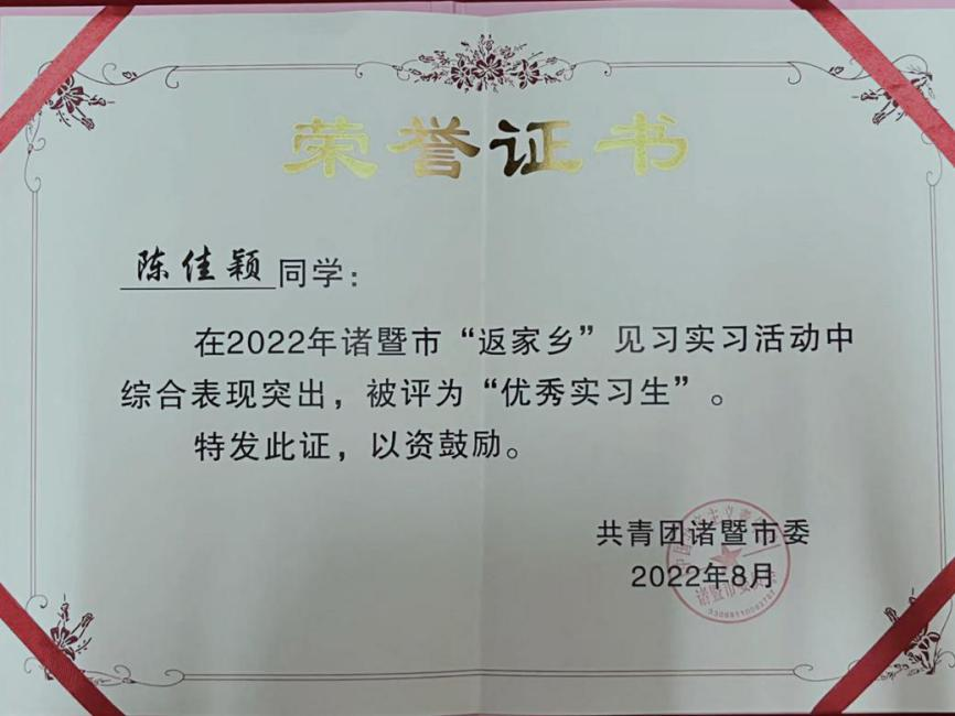 太阳官网学子在共青团诸暨市委2022大学生“返家乡”见习实习中喜获“优秀实习生”