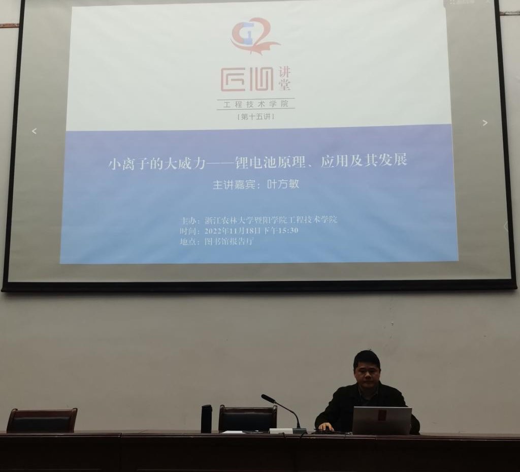 11月18日下午,浙江理工大学叶方敏博士受邀来工程技术学院作了题为“小离子的大威力---锂电池原理、应用及其发展”的专题学术讲座,相关专业领域教师和学生参加讲座。
