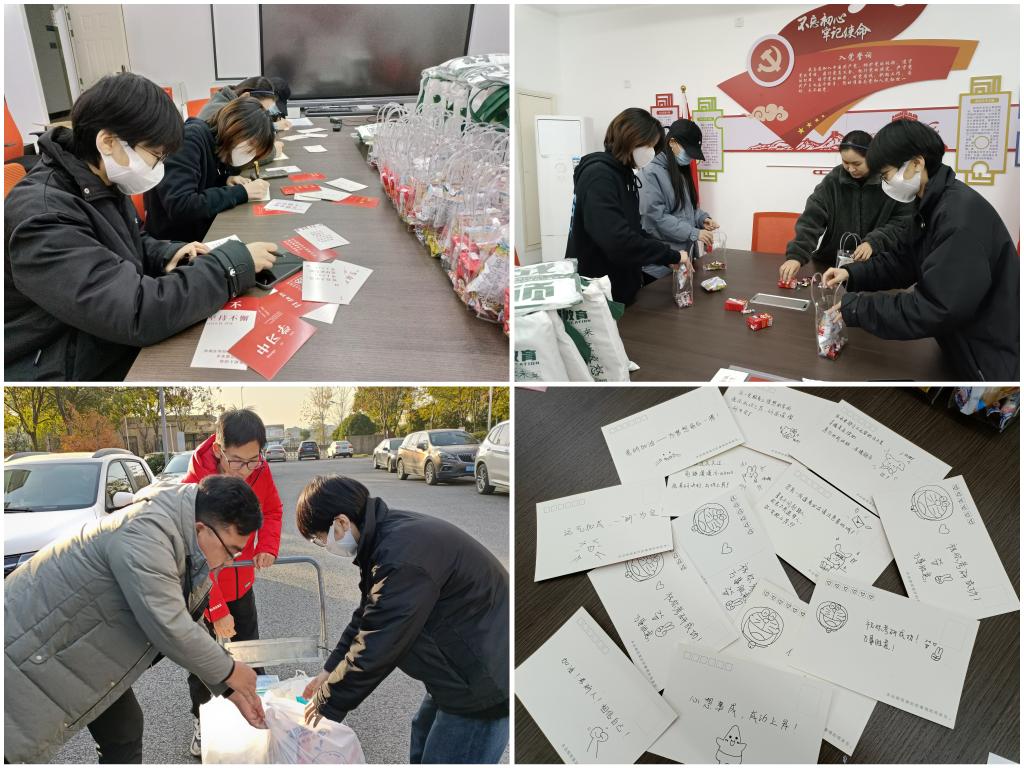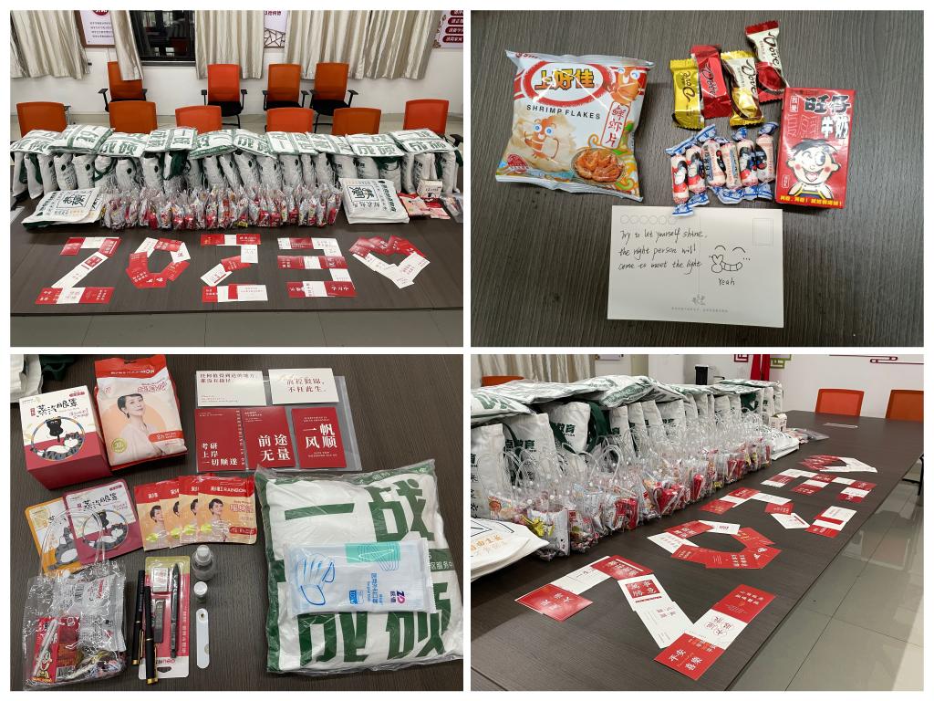当天上午,晨晓艺术与设计学院领导、老师与考研学子代表在理工1404会议室开展面对面交流,倾听学子的心声,并以亲身经历鼓励大家积极备考。同时,师生还走进考研教室,查看考研自习室的环境,了解备考的氛围,并为学生送上精心准备的考研加油包。加油包内包含了文具套装、抱枕、暖身贴、蒸汽眼罩、口罩、消毒水、零食礼包,还有师生亲手绘制的带有祝福的卡片。“8月份的清凉饮料,12月份的暖心加油包,学院送的礼物也太有爱了!”复习考研的同学概叹道。爱心、贴心、暖心的慰问让同学们感动满满,同时也为他们安心备考增加了信心。