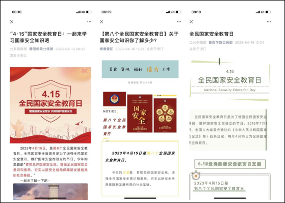 4月初公共保障部发布《关于开展全民国家安全教育日宣传教育活动的通知》,各单位认真组织师生参与“千万师生同上一堂国家安全教育课”,通过中国大学生在线官网及中国大学生在线视频号、微博、快手、B站等直播平台,组织学生错峰观看学习。同时以图片展览、横幅宣传、视频观看、知识宣讲等多种形式,通过线上线下学习、宣传教育等传播渠道,营造浓厚的宣传氛围,提高全体师生国家安全意识。