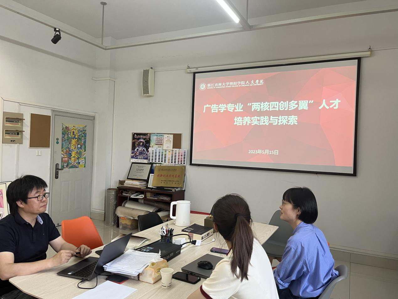 汪永奇对徐烨、张晨的来访表示欢迎,介绍了人文学院广告学专业发展、师资队伍建设等基本情况;同时重点介绍了基于广告学专业“双核四创多翼”人才培养的探索与实践,分享了以创意工作室为组建单元,“双核四创多翼”课程群的协同教学模式;对近年来人文学院师生创新、创意、创作、创业的“四创”成果进行了展示和分析,同时也对以《广告设计》《广告策划》课程为“双核”带动其它“多翼”课程群的教学模式进行了介绍。