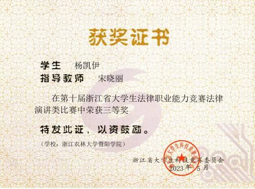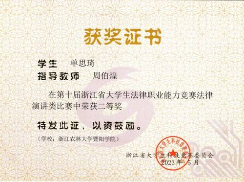 5月14日,在浙江省第十届大学生法律职业能力竞赛法律演讲类比赛中,人文学院、马克思主义学院法学专业学生斩获佳绩。周伯煌教授指导的单思琦同学获得二等奖,蒋春华老师指导的厉悦凝同学获得二等奖,宋晓丽老师指导的杨凯伊同学获得三等奖。