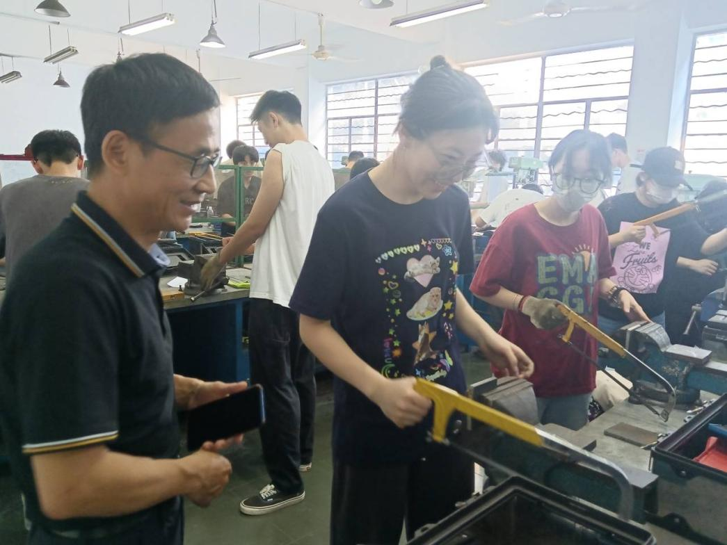 工程技术学院院长彭樟林赴实习场地,看望正在实习的学生,详细了解学生们所进行的实习项目,并现场指导学生如何运用正确的姿势加工零件。他强调,此次工程训练是重要的实践教学活动,也是同学们一次宝贵的学习机会,要将所学的理论知识与实际操作相结合,加深对机械工程的理解,为未来的职业生涯做好准备。