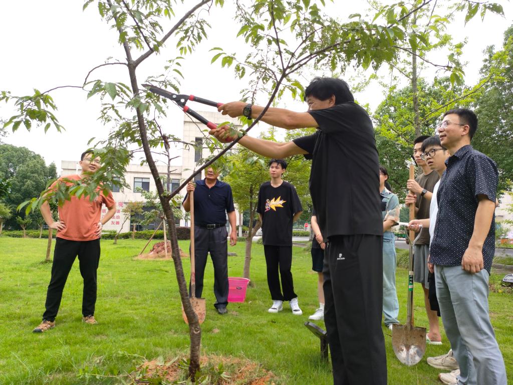 随后,在教师的带领下,同志们干劲十足——挥锹铲土、中耕除草、苗木修剪、提水浇灌。大家分工协作,密切配合,活动各个环节井然有序。