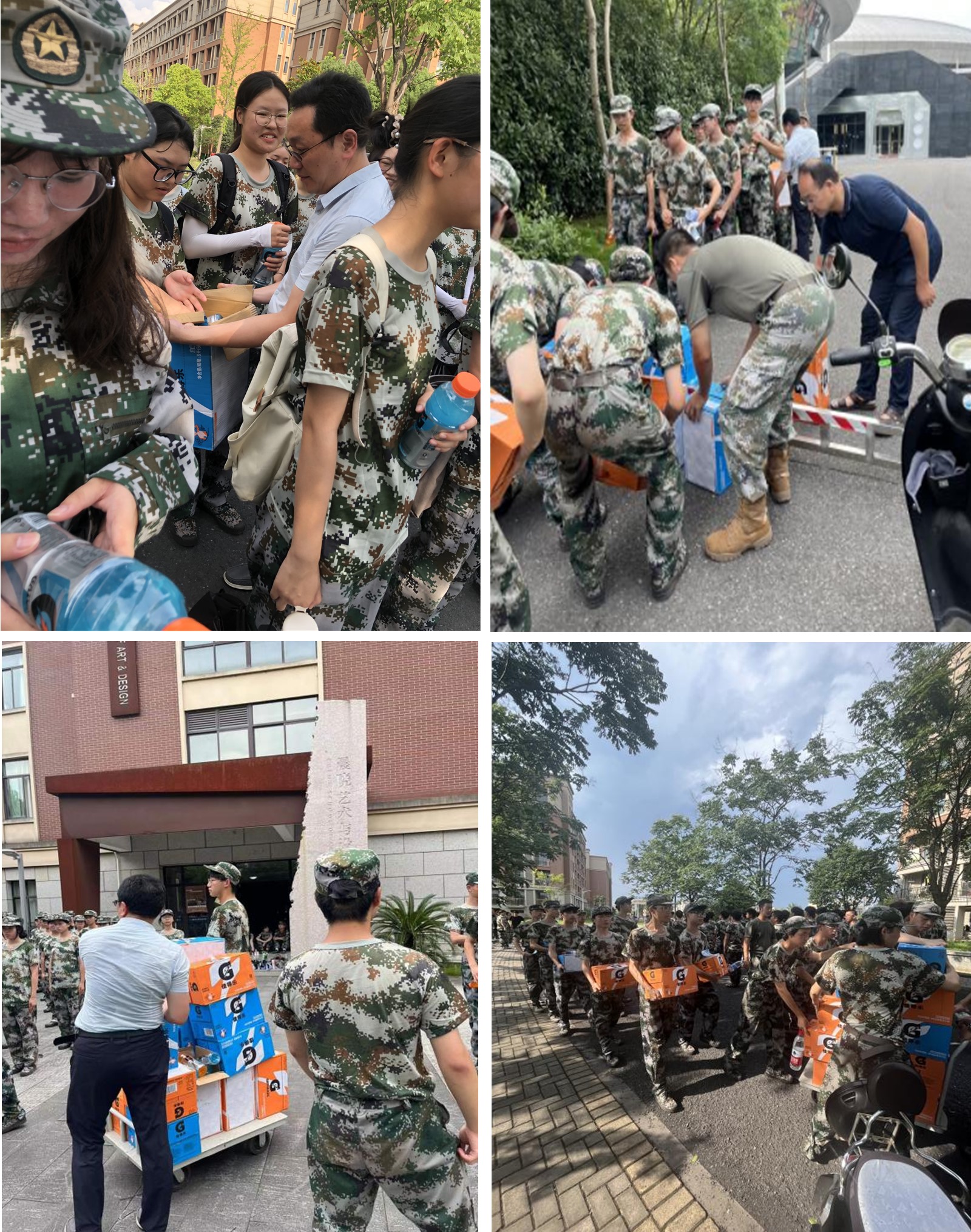 军训场上,各项训练正按照计划进行,军训教官指挥有度,学生们步伐整齐。何红光和张佩成对大家高昂的军训热情、良好的精神状态和端正的军训态度表示赞许,并给每位教官、学生发放运动饮料,叮嘱大家及时补充水分和电解质,使学生们在炎炎夏日感受到一丝凉爽。