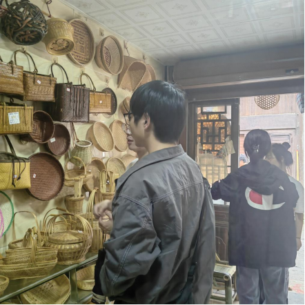 探寻深巷小铺,溯源竹编史末。走访完袁建虎师傅的工作室后,实践团成员们赶往下一站——草塔老街百年竹器。映入眼帘的是满墙的工艺品,实践团成员怀着好奇之心欣赏着老师傅制作的精巧工艺品。在与老师傅的对话中,实践团成员们了解到,竹编可分为细丝和粗丝竹编工艺品,它的制作可以分为起底、编织和锁口三道工序。在编织的过程中,主要以经纬编织法进行编织,期间会根据需要选择合适的其他穿插方法,比如:插、锁、削、疏编、套、扎等。百年竹器店的郭健苗师傅感叹道:当代年轻人,不愿意沉心于传统的手艺,大多手艺,到他们这一代也就断了。他十分热情地向实践团成员介绍他所有的竹编制品,并真切希望我们这一代青年能够将传统手工艺传承下去,让手艺所蕴含的精神能够坚守下去。