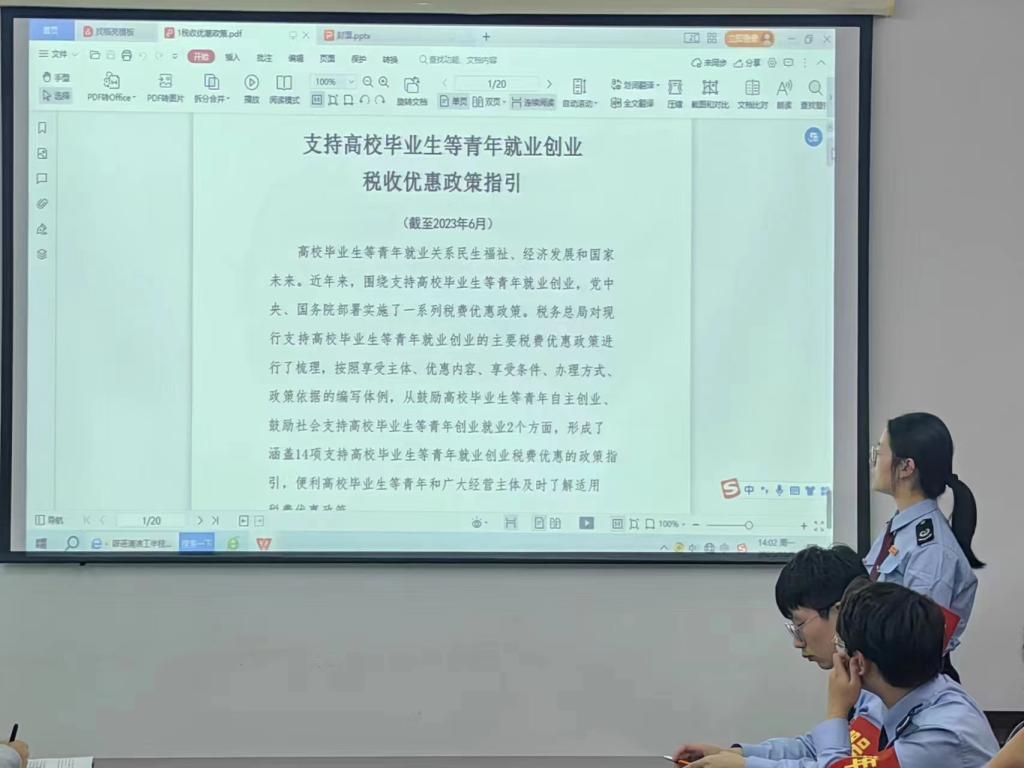 广大高校毕业生就业关系民生福祉、经济发展和国家未来。邹泓婕表示,党和国家大力支持高校毕业生就业创业,并为其提供创业税费扣减等多项优惠政策。她结合实际案例向同学们强调了政府提供的创业优惠政策在大学生就业创业过程中的重要作用,让同学们对相关优惠政策有了更深层次的理解与认识。