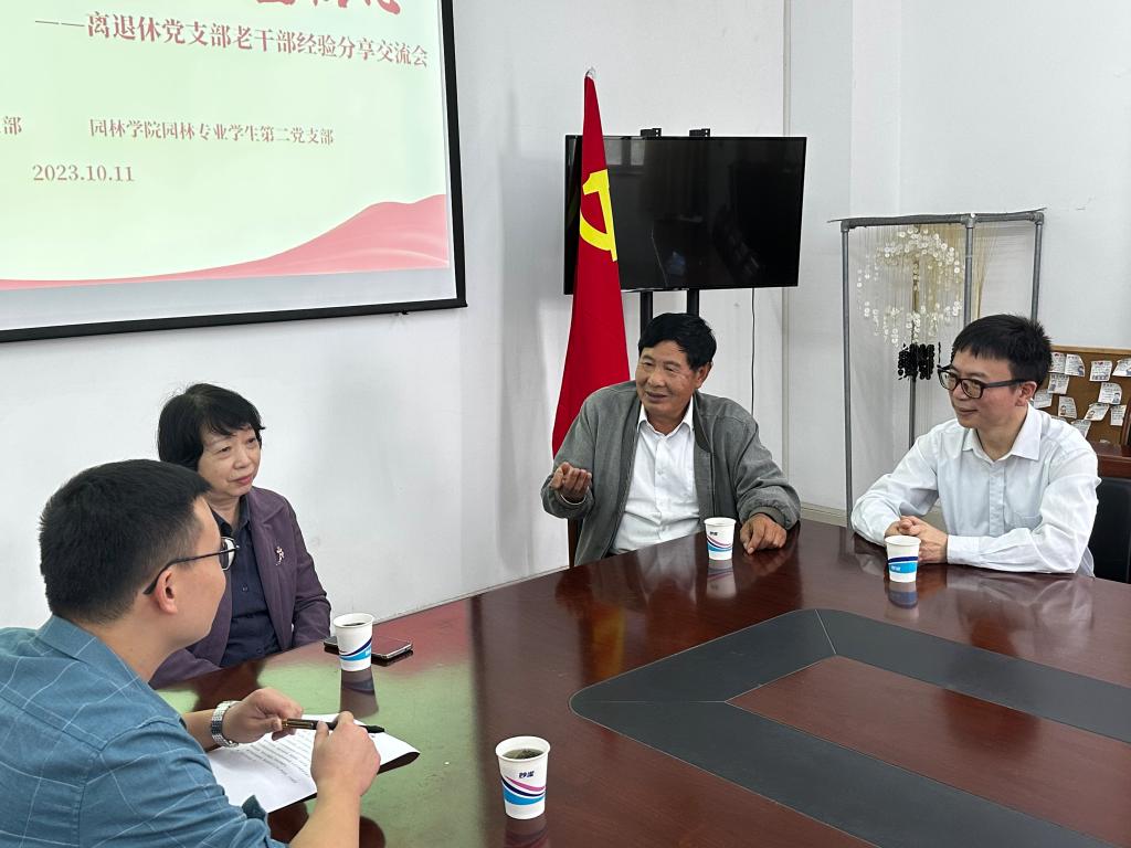 10月11日,学校离退休第七党支部与园林专业学生第二党支部共同举办“结对传帮带 重阳忆初心”老党员经验分享交流会。园林学院党总支书记徐涌,离退休第七党支部党员葛信波、鄢圣英以及园林专业学生第二党支部党员参加此次活动。