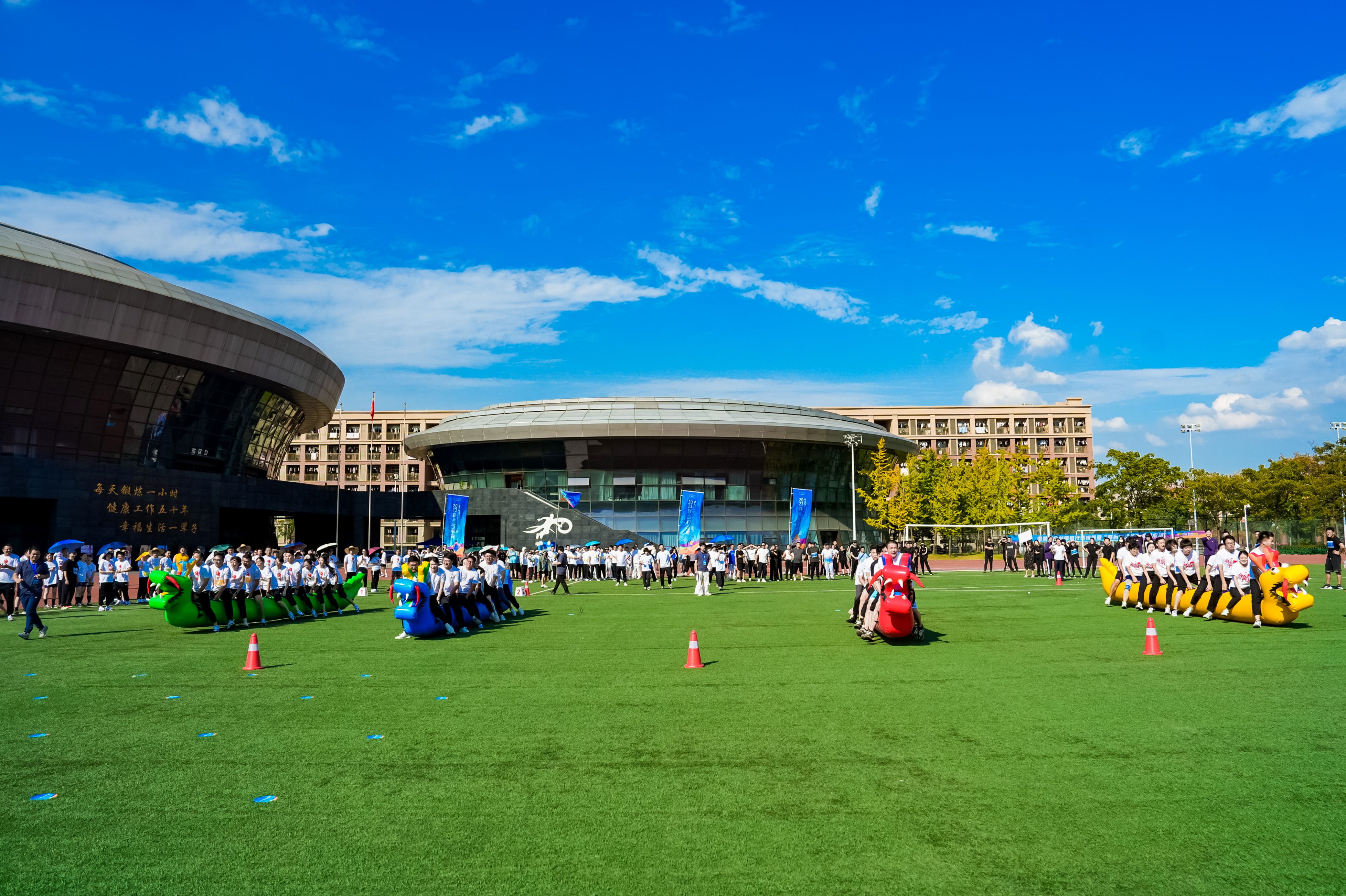 本次运动会共有三个项目,分别是集体项目、趣味项目和球类项目。集体项目包括工间操比赛、“4*100”混合接力、跳大绳、拔河比赛;趣味项目包括陆地龙舟、砥砺前行、大展鸿兔、联合飞宝、争分夺秒;球类项目包括气排球、篮球和羽毛球。