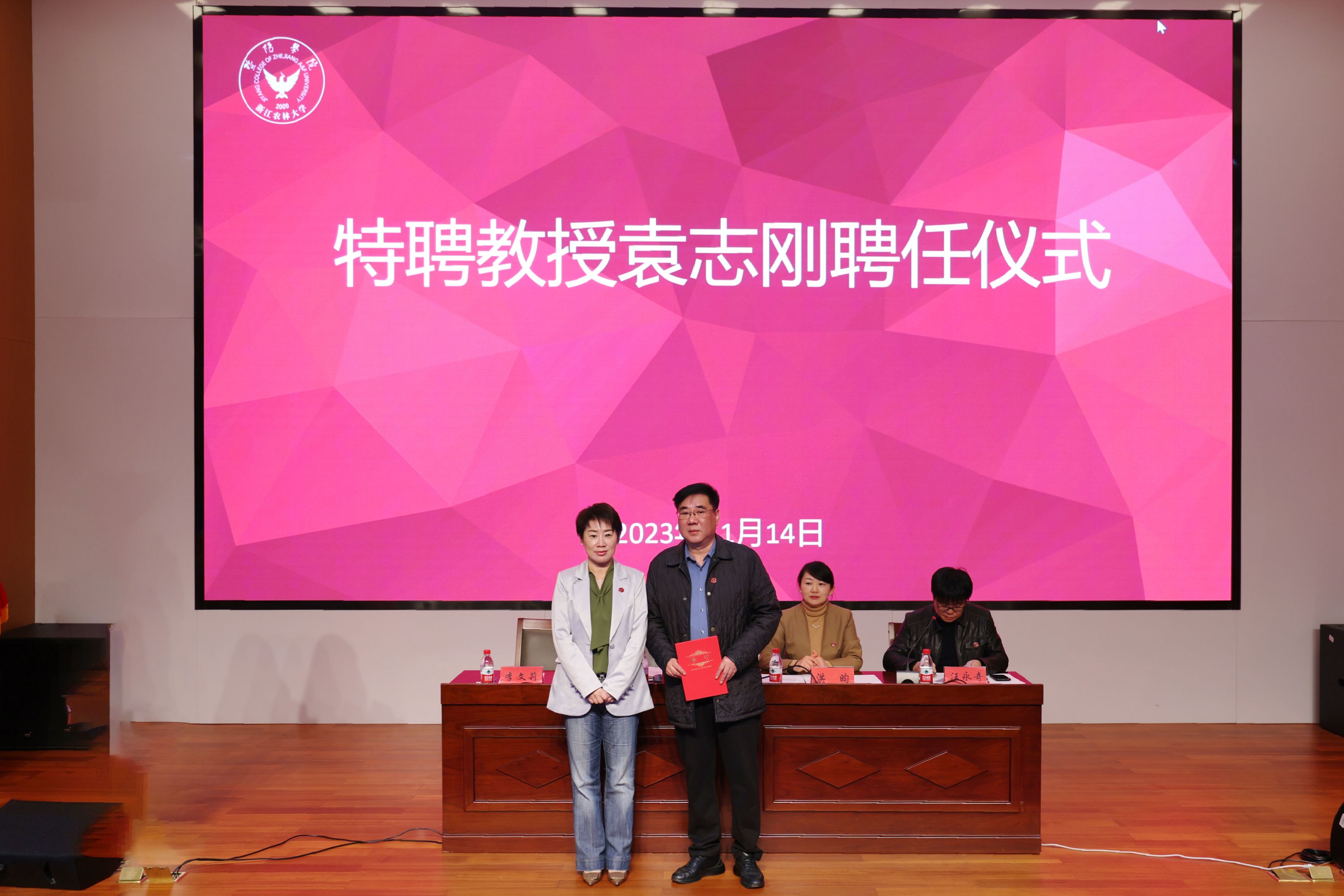 李文莉向袁志刚同志颁发特聘教授聘书、佩戴院徽并表示感谢。