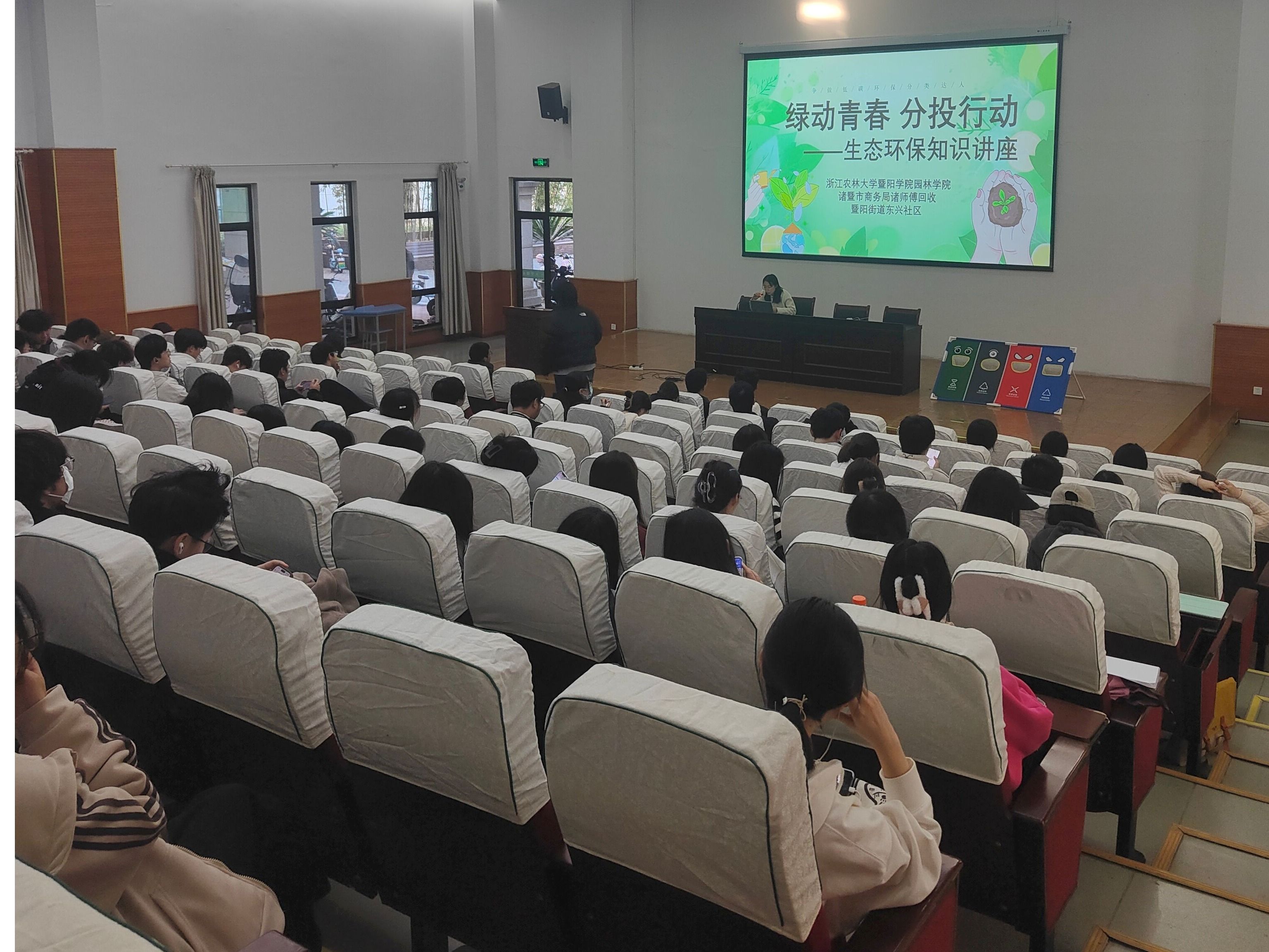 为进一步提高广大师生的生态环保意识和责任感,增强师生的生活垃圾分类意识,培养他们垃圾分类投放行为习惯,11月29日,园林学院携手诸暨市暨阳街道东兴社区、诸暨市“诸师傅回收”,在人文4110联合举办“绿动青春 分投行动”生态环保知识主题讲座。