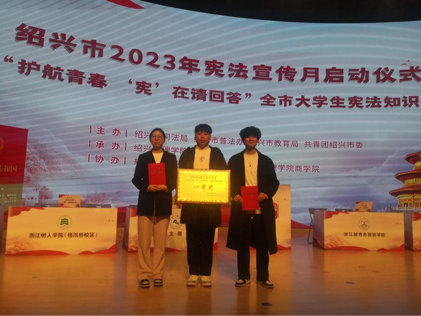 12月3日,由绍兴市普法办、司法局、教育局、共青团绍兴市委主办,绍兴文理学院承办的“护航青春,‘宪’在请回答”全市大学生宪法知识竞赛决赛在绍兴文理学院风则江大讲堂举行。人文学院法学211班王宏昌、方瀛娅,法学231班杨浩文三位同学组成的团队代表太阳成集团tyc33455ccwww并荣获一等奖。