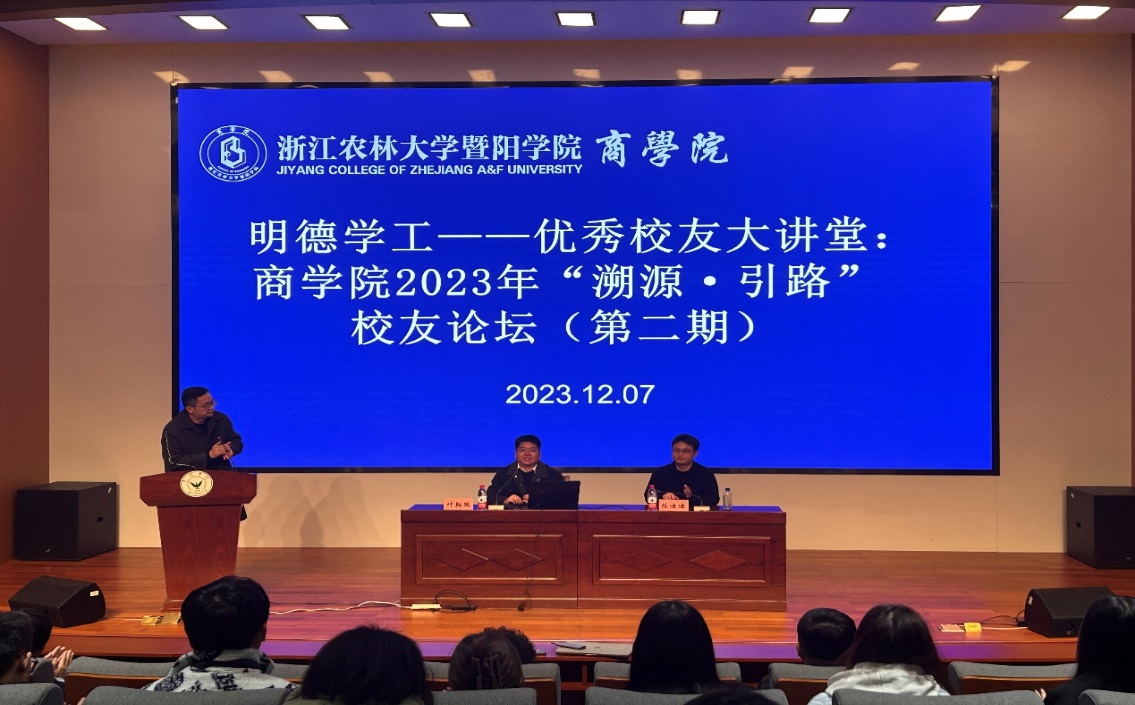 12月7日晚,商学院2023年“溯源·引路”校友论坛第二期在智能报告厅5111成功举办,本次论坛由商学院2015届电子商务专业陈迪迪和2011届信息管理专业叶翔鹤两位优秀校友主讲,商学院党总支副书记屠蒋威主持,100余名师生代表参加了本次讲堂。