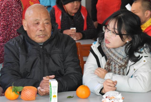 活动中,大学生为老人送上水果、牛奶等慰问品,叮嘱老人在寒冷的冬日里多补充营养,提高抵抗力。