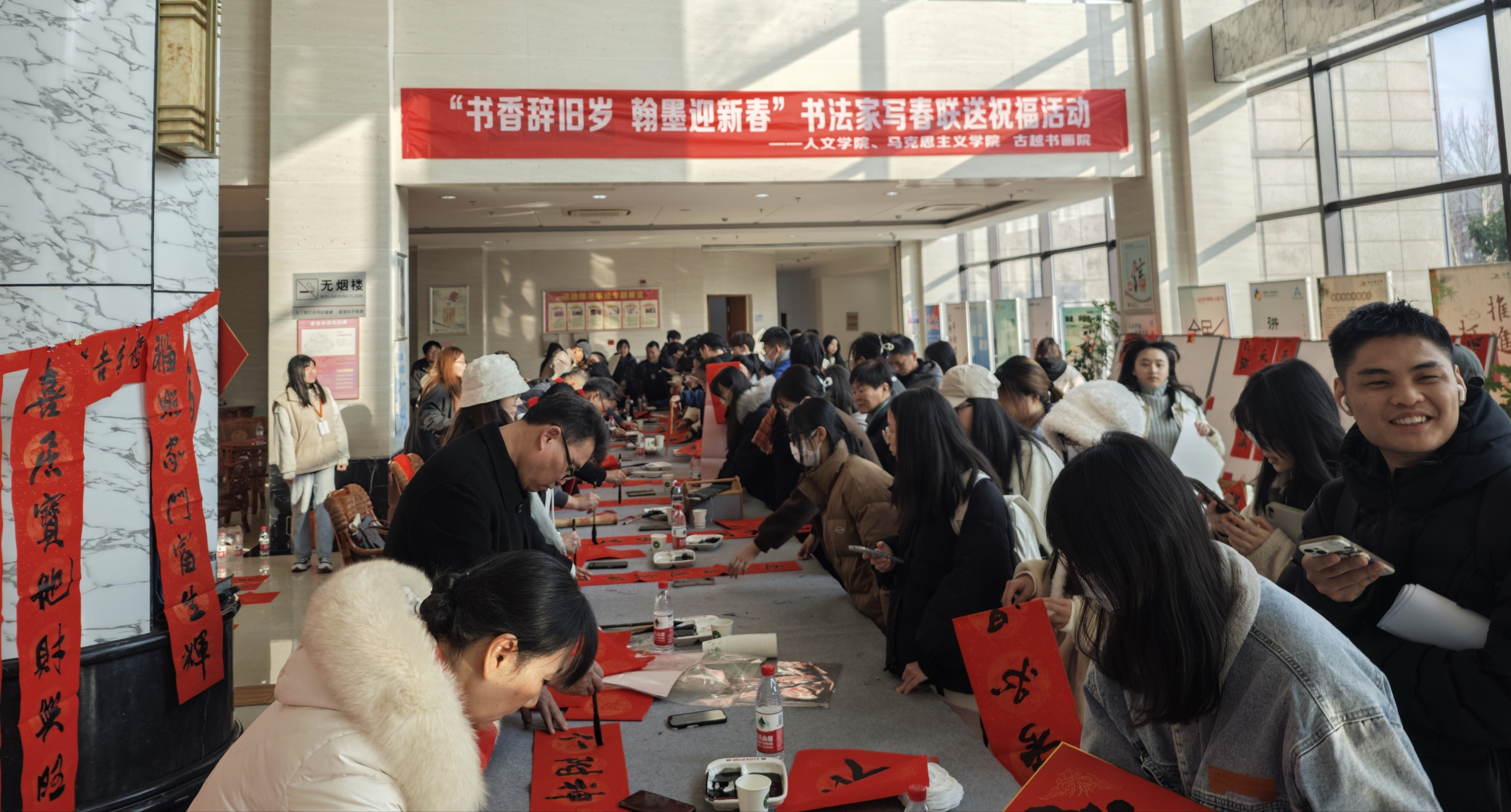 辞旧迎春,为弘扬中华优秀传统文化,营造节日欢快祥和氛围,1月3日,人文学院、马克思主义学院联合古越书画院组织开展的“书香辞旧岁 翰墨迎新春”写春联送祝福活动在学院图书馆一楼大厅顺利举行。