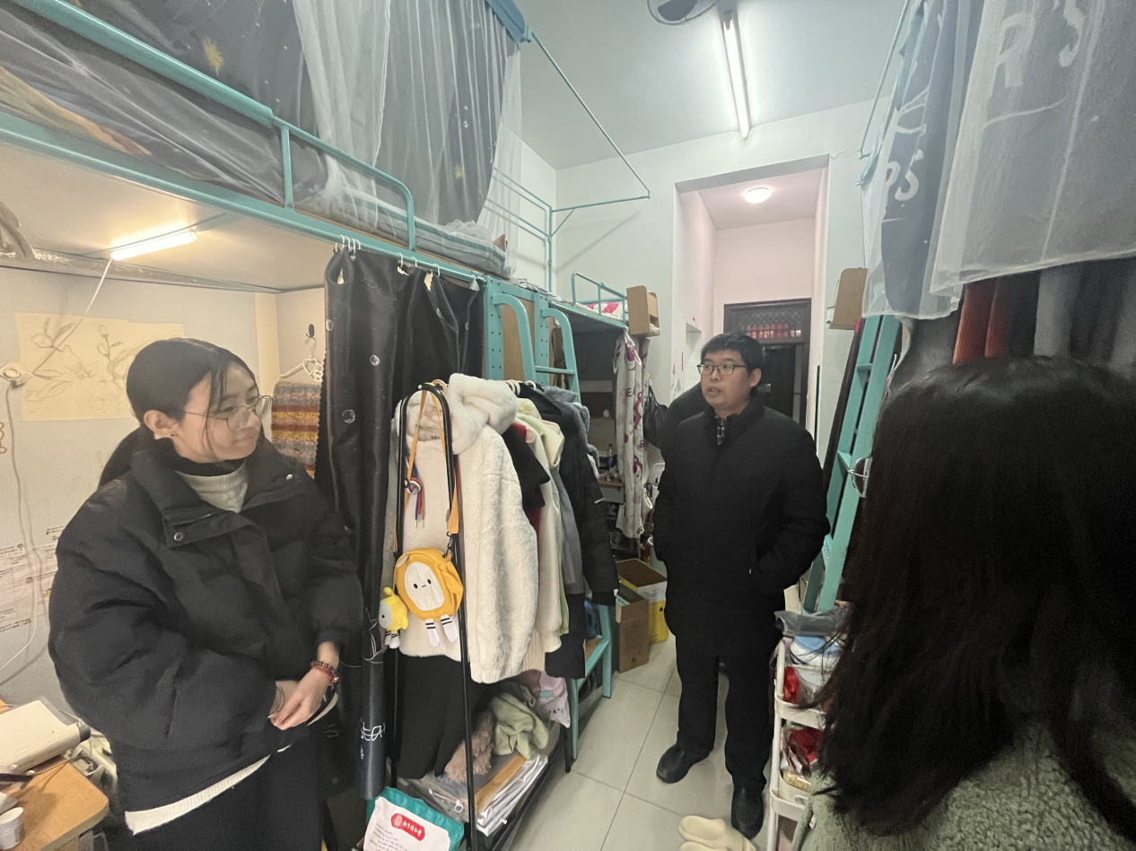 马忠兴带队深入学生社区,对寝室内的环境卫生、安全设施、用电规范等进行细致查看,并提醒学生注意离校前关闭电源、确保宿舍环境整洁,检查是否存在违禁电器、私拉乱接等安全隐患。同时,对寝室内乱堆乱放、垃圾未及时清理等问题给出具体的改进建议,督促相关同学立即整改。
