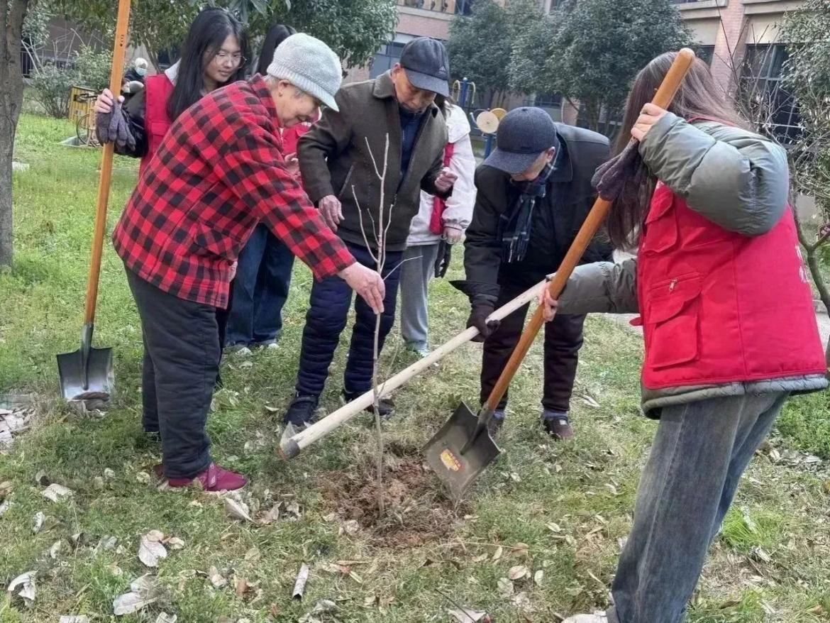 挥锹松土,助培小树。活动现场,随处可见学生志愿者辛勤植树的身影,所有人干劲十足、分工明确,与老人们配合默契。有人穿梭往来搬运树苗,有人挥动铁锹挖坑填土,有人提水浇灌幼苗……大家齐心协力,认真细致地栽种好每一棵树苗,活动现场气氛热烈。志愿者们还细心地为每位老人准备了座椅,确保他们在劳累时能够得到休息。老人们与志愿者们亲切交流,他们纷纷表示,看到这些绿意盎然的树苗,仿佛看到了生活的希望与活力,感受到了社会的关爱与温暖。